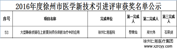 12月21日,徐州市卫生计生委正式公布了2016年市医学新技术引进评审结果。betway在线登陆手外科黎章灿、郑大伟、石荣剑团队完成的《大型静脉皮瓣在上肢复杂损伤保肢治疗中的应用》项目,获得二等奖。这是我院在人才培养和科研创新方面又一重大成果。