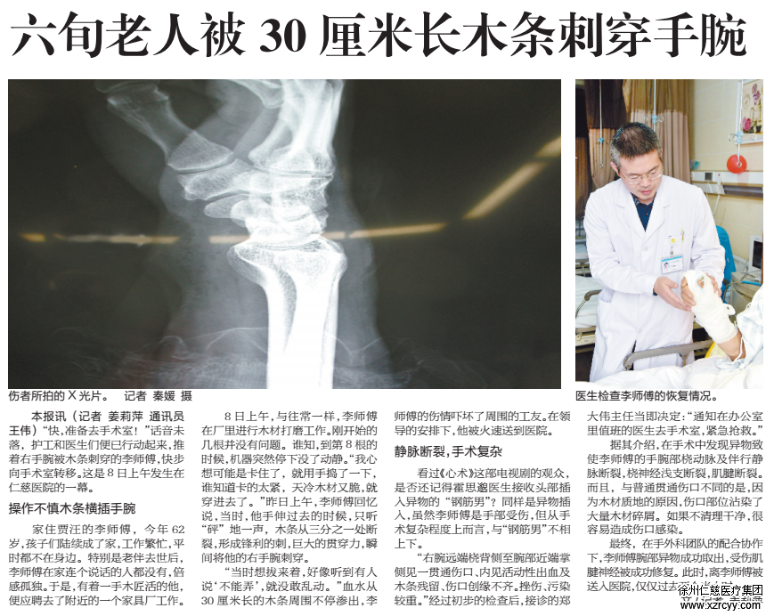 “右腕远端桡背侧至腕部近端掌侧见一贯通伤口、内见活动性出血及木头残留、伤口创缘不齐。挫伤、污染较重。”经过初步的检查后,接诊的郑大伟主任当即决定“通知在办公室里值班的医生去手术室,紧急抢救”。