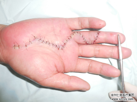 朱辉主任介绍,掌腱膜彻底切除术,以挛缩线做纵轴,设计多处“Z”字切口,沿掌横纹与大小鱼际纹的切口,翻开皮瓣后,将重要的神经、血管、肌腱等重要组织分离清楚后,切除挛缩的掌、指腱膜组织。手术时长1小时左右。与其它治疗方式相比,这种手术效果好、恢复快、复发低。他建议,病人身体情况能耐受稍大的手术者,都应考虑将掌腱膜彻底切除。