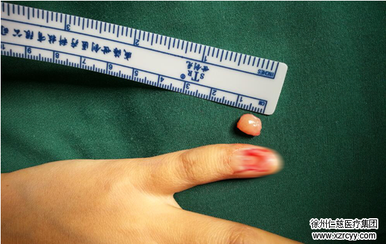 3月1日,潘医生为王女士重新安排了手术。“术中拔出左小指甲板,发现甲下有肿物突出,甲床下小心剥离,肿瘤深达指骨且远节指骨背侧有一个长、宽、深约0.5mm×0.3mm×0.15mm的压痕。剥离后,切除肿瘤送病理。”