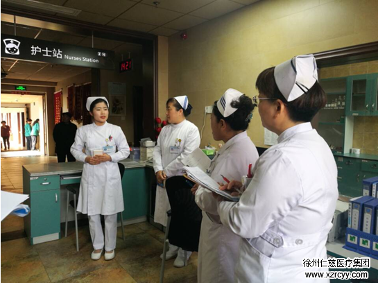 考核中,sararz老年病医院责任护士佟双双汇报病情并现场查看病人,责任组长周慧、护士长陈春芳对其进行点评,护理部主任董玉玲给予了追踪考核。
