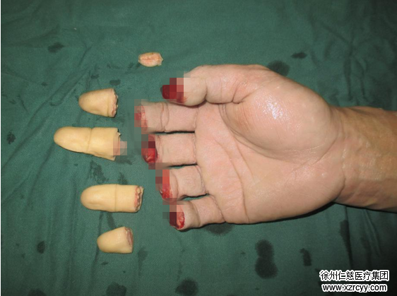 原籍沛县的孙先生,举家在山东临沂做壁纸加工生意。3月7日下午1:30,刚开工不久,操作裁切机器的孙先生因一时不察,不慎被机器严重切伤,导致右手5根手指离断。指的集体“离家出走”,吓坏了在一旁捆绑材料的妻子。匆忙中用卫生纸捧起断指后,妻子赶忙陪同孙先生,到当地医院就诊。