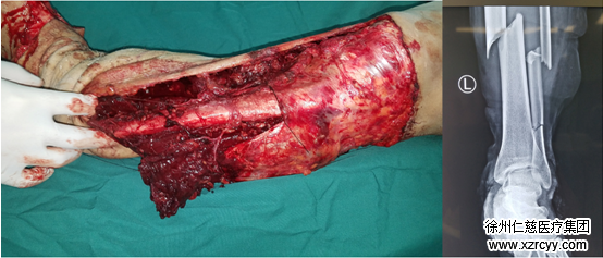 伤情:左侧创伤性小腿切断,皮肤脱套