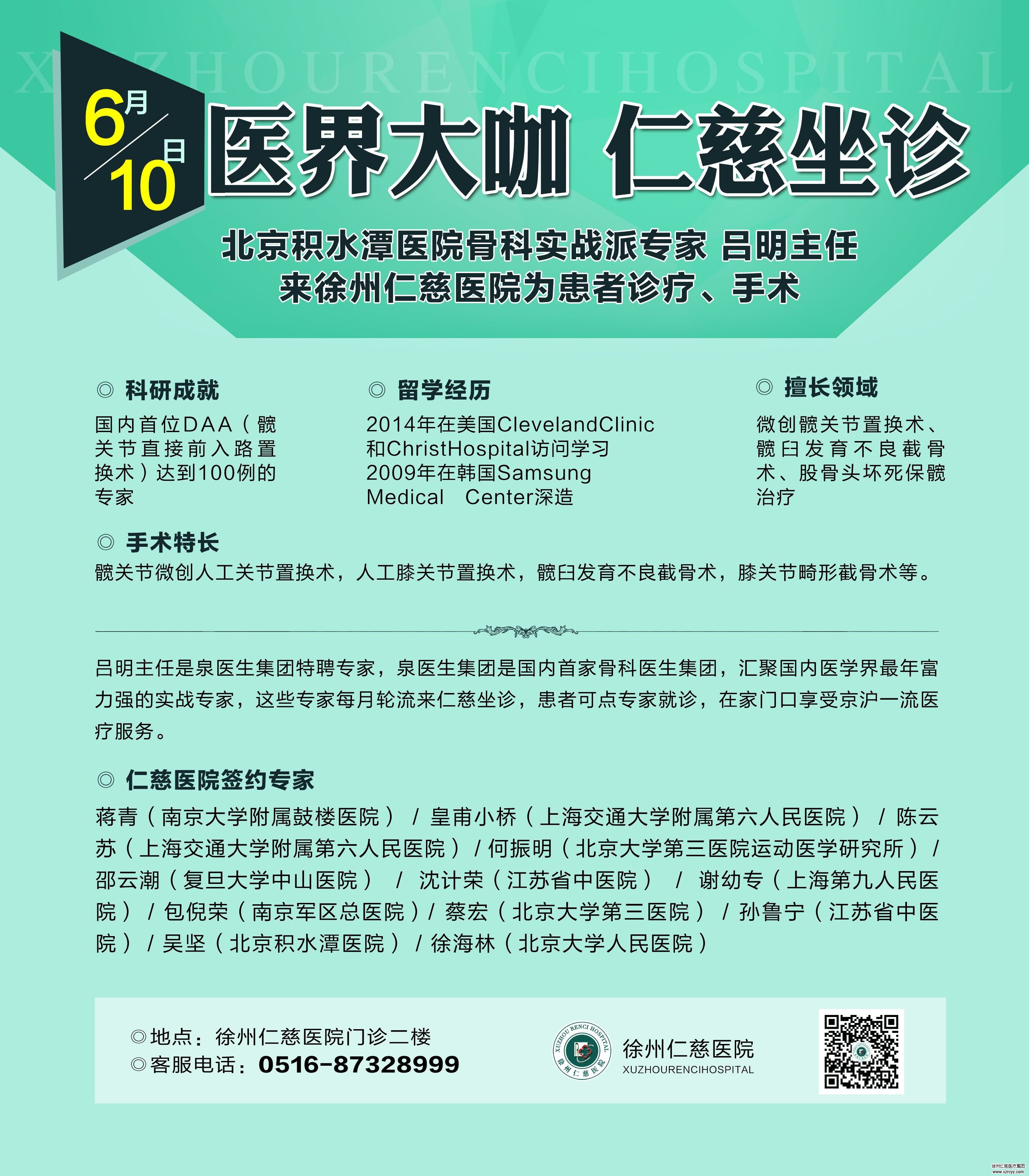 继5月20日北大三院关节外科专家蔡宏主任、上海九院脊柱外科专家谢幼专主任来sararz坐诊之后,本月10号,北京积水潭医院矫形骨科吕明主任将来betway在线登陆坐诊,为患者提供北京一线专家服务。众多国内知名专家的到来,免去了徐州患者辗转各大城市的麻烦,一号难求的专家号在家门口就可以轻松预约到,让看病变得很轻松。