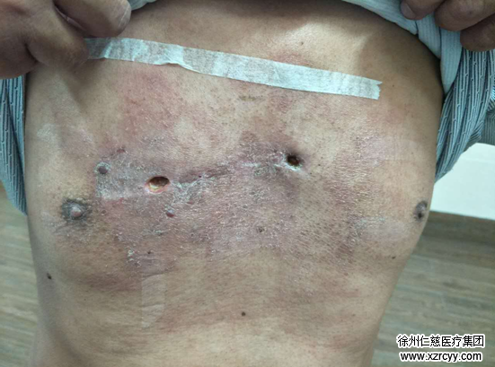 今年43岁的孙先生,胸前长有瘢痕疙瘩已近20年。半年前,孙先生于外院接受瘢痕手术,并与术后做了放射线照射手术部位治疗。没成想,意外出现了。射线治疗10次后,孙先生胸口居然莫名“烧”出2个洞(医学名:窦道)。