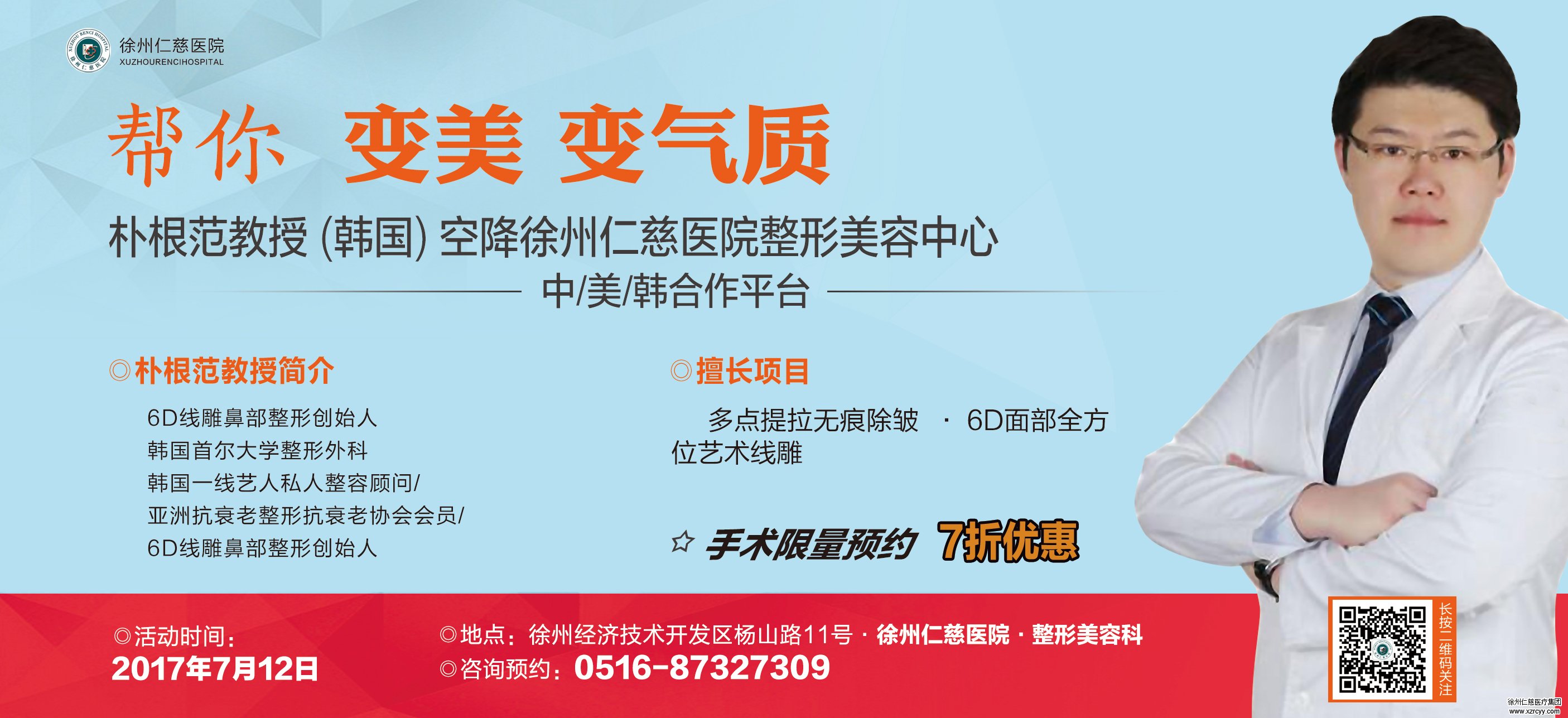 对于钟情于微整形的爱美女性来说,还有【更重磅】【更惊喜】的,本月12日,来自韩国的明星御用整形大咖,韩国首尔大学整形美容科专家,6D线雕面部艺术提升术创始人朴根范将空降徐州,亲临必威官方首页官网betway,手术限量预约(7-10人)!