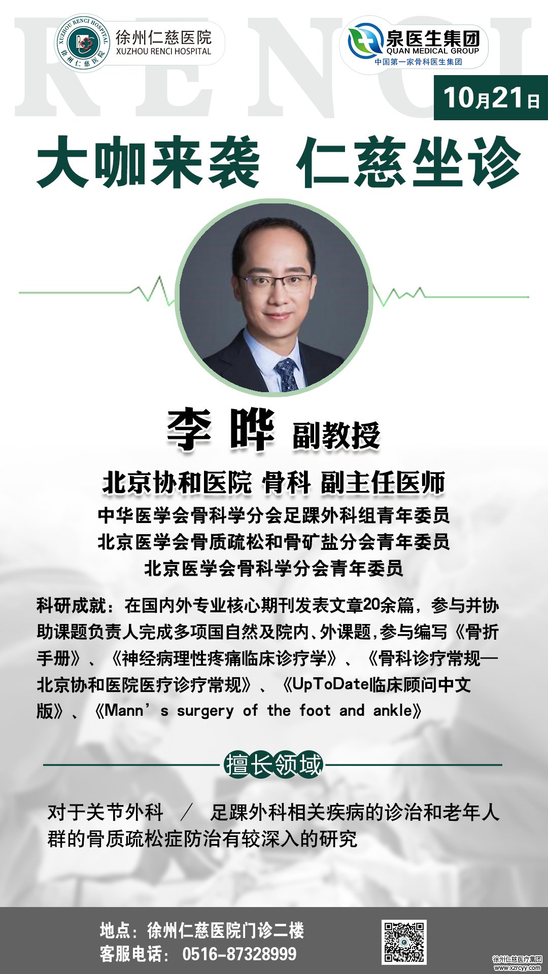 同样是医学博士出身的李晔教授是北京协和医院骨科的副主任医师,对于关节外科、足踝外科相关疾病的诊治和老年人群的骨质疏松症防治有较深入的研究。