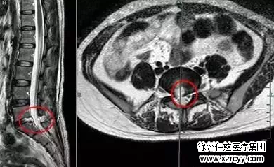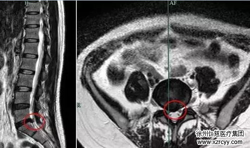 术前腰椎MRI显示可见L5/S1有突出,神经受到压迫(如红圈所示)
