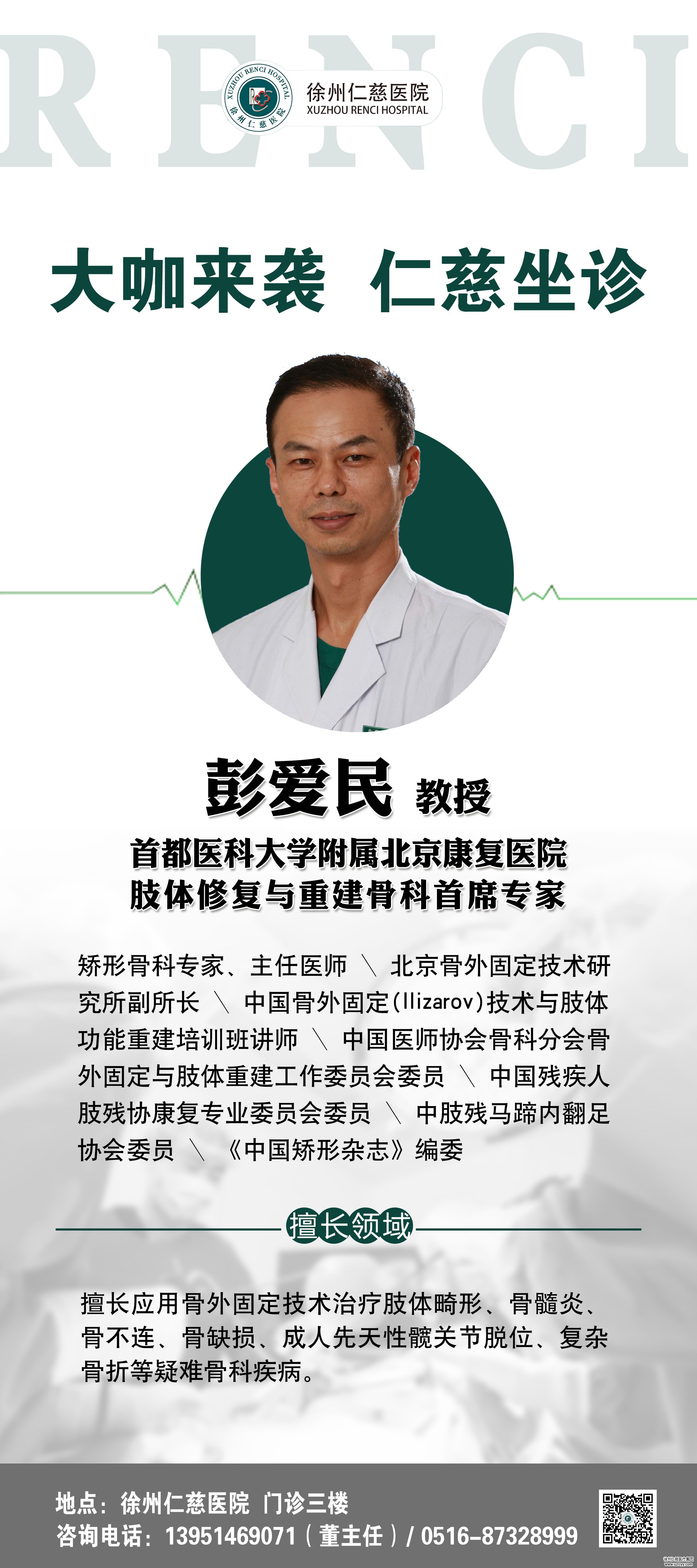 彭爱民教授长期致力于骨外固定技术的临床研究和应用,颇有建树。此前,彭教授曾多次受邀来我院为徐州及周边地区的患者亲诊手术,运用目前国际领先的Ilizarov技术完成了多例高难度的骨科矫形修复手术,帮助多名先天缺陷或后天畸形的患者重获新生。其良好的医德医风、精湛的医疗技术得到了患者的一致好评。