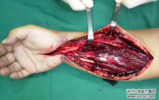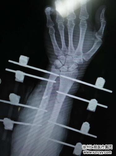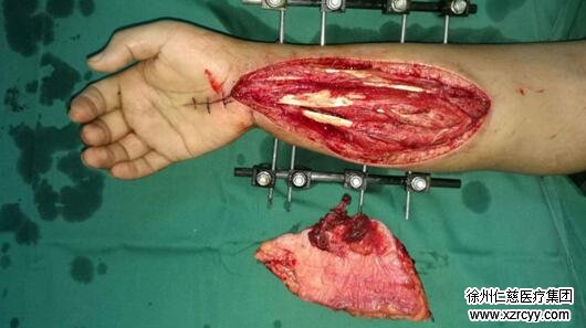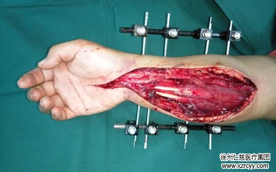 各项检查完毕后,手术室内,由于右臂异常肿胀,小张的右前臂切开后创面就像熟透的西瓜炸裂一样难以缝合。“我们首先对他进行了切开减压与清创,然后修复了损坏的血管与神经,因为患者右尺桡骨骨折,我们复位后给患者进行了外固定支架固定。患者后期还需皮瓣修复创面,他的前臂皮肤软组织缺损面积较大。”黎医生说。