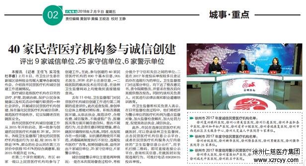 2月8日,一份有关全市民营医疗机构诚信排名的“琅琊榜”揭晓——由徐州市卫计委组织专家学者参与评审的“徐州市2017年度诚信民营医疗机构”榜单正式面向社会公布。继摘得我市“首批诚信民营医疗机构”桂冠后,