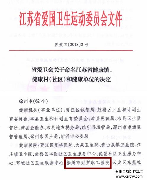 近日,江苏省爱国卫生运动委员会印发文件,对2017年江苏省健康镇、江苏省健康社区和健康单位进行了命名表彰,徐州sararz老年病医院(财贸职工医院)榜上有名,获得“江苏省健康单位”称号。这是徐州财贸职工医院获得的又一张闪亮名片。