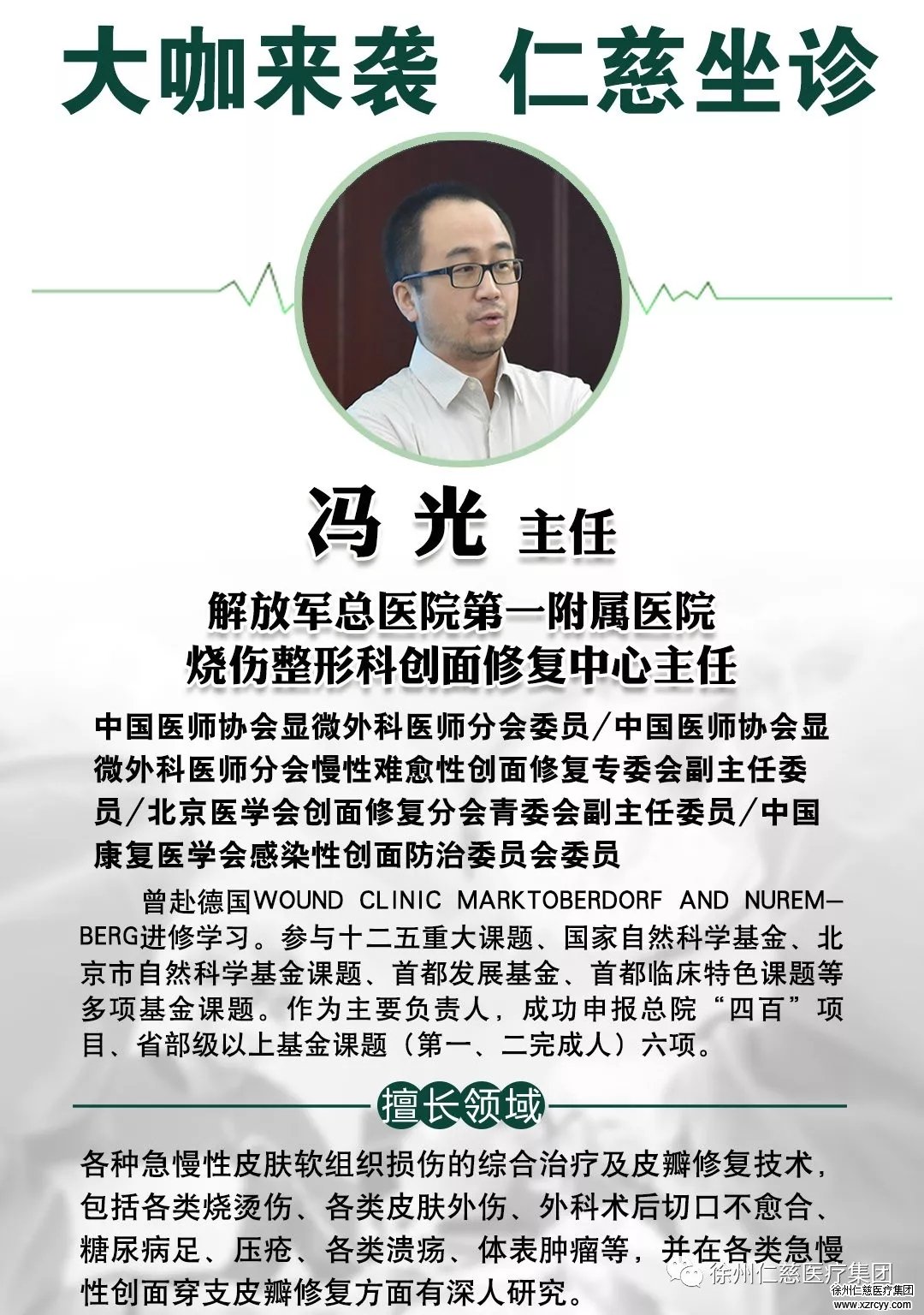 冯光教授为解放军总医院第一附属医院(北京304医院)烧伤整形科创面修复中心专家,中国医师协会显微外科医师分会慢创专委会副主委,擅长急慢性皮肤软组织损伤、糖尿病足褥疮、外科术后切口不愈合等的治疗,作为创面修复的骨干专家,在糖尿病足、压疮、外科术后切口不愈合及各种意外伤后皮肤软组织损伤的综合治疗方面积累了丰富的临床经验,取得了卓有成效的研究成果。