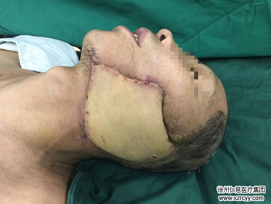 经多次清创后,黄振、周晶、潘珍乙手术团队利用熟练的显微外科血管吻合技术,为李海实施了面部扩创、右大腿股前外侧游离皮瓣移植修复面部术,患者为犬咬伤,伤口污染重,无法一期修复创面。根据患者面颊缺损大小及形状,在股前外侧切取相应皮瓣,成功重建患者面颊。该皮瓣供区较隐蔽,面积大、血管蒂长,适宜于面颊各部分缺损修复,还可带肌肉,修复大范围深层组织缺损。