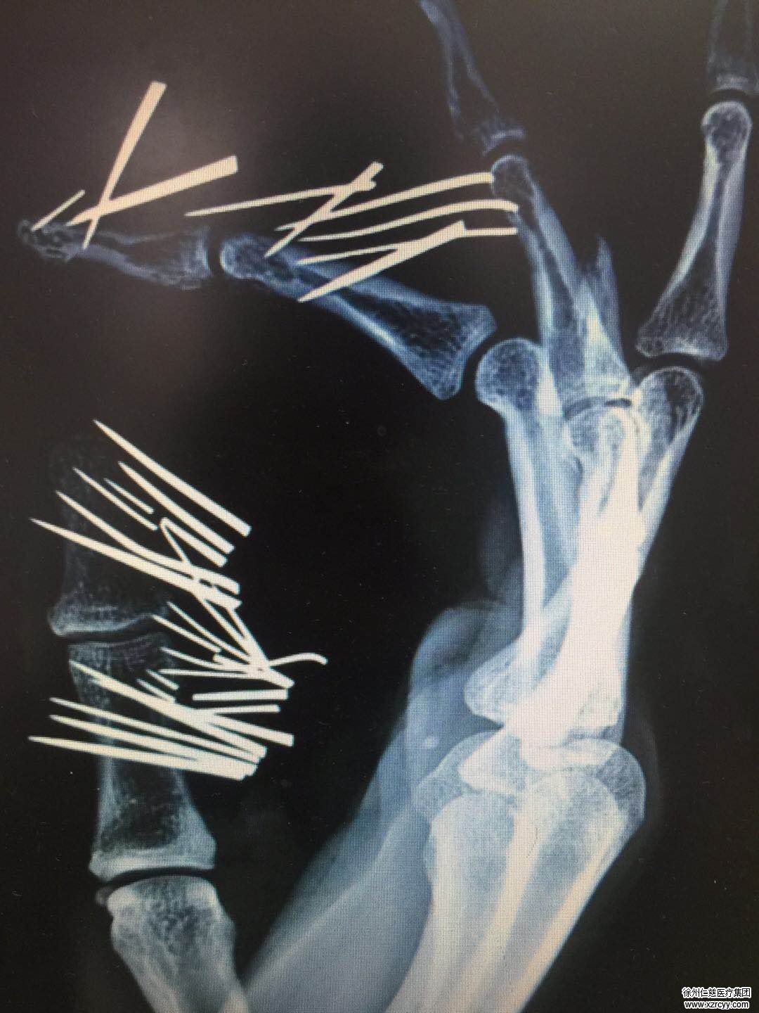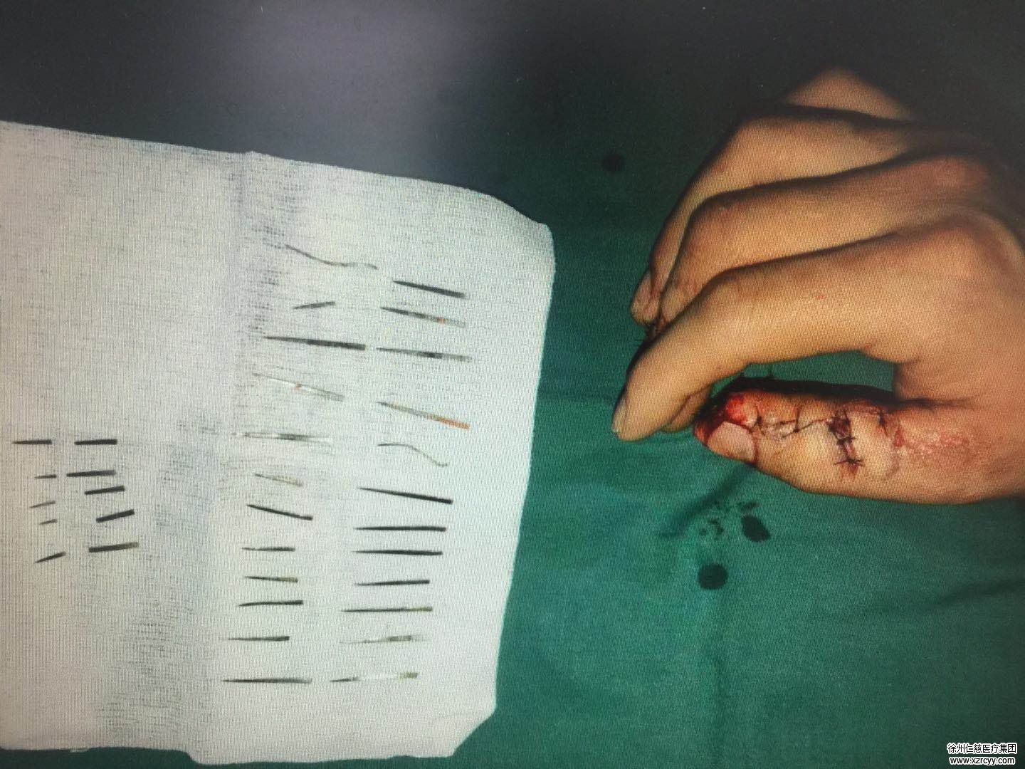 经过一个多小时的紧张而又耐心的抽丝剥茧,34枚大小、形状不一的钢针从蒋女士的右手拇指和中指中被相继取出,随即医护人员又通力配合对损伤的血管和神经进行了修复。