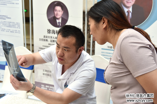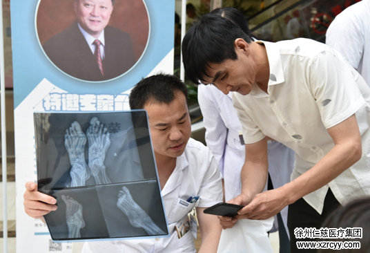 下午不到1点,已经有病人早早坐在足踝桌前等待。很快,足踝科曹广超主任来到,病人和家属立刻围上来,曹主任一刻不停,投入到义诊中。