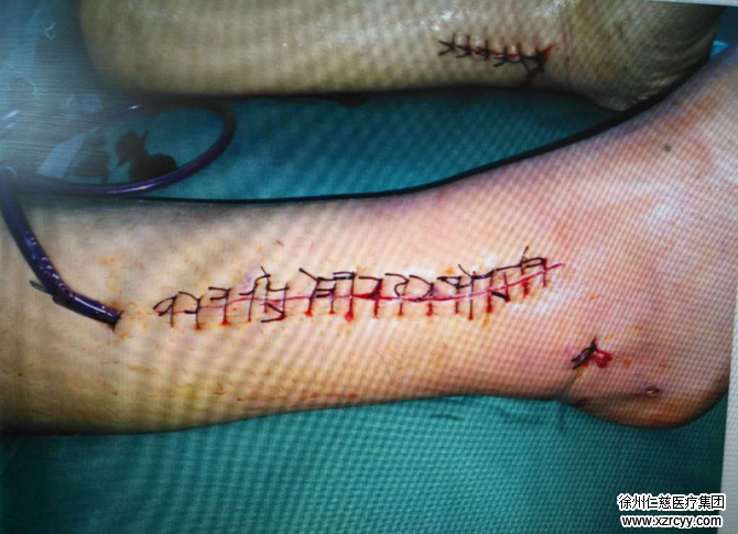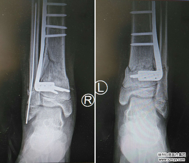 术中,先进行左胫骨骨折切开复位内固定,在左小腿前外侧切15cm的切口,见患者胫骨骨折断端错位明显,累及踝关节,并伴有胫骨骨骺损伤,又在小腿后内侧切5cm的口子,复位骨折端,置入“L”型锁定接骨板,定住骨折块;右胫腓骨骨折同样处理,双侧踝关节辅以石膏夹板外固定。手术共进行了5个小时,获得成功。