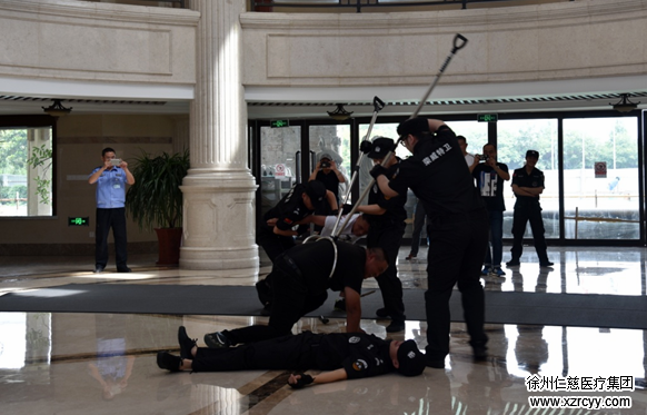 为切实做好各种突发公共事件的应急处置工作,积极营造 “让患者放心”的安全医疗环境,6月22日,我院联合徐州市荣威保安服务有限公司组织开展了“2018年度‘安全生产月’反恐消防安全演练”。副院长舒鹏、院保卫科全体人员及临床、行政科室人员代表现场观摩并参与了演练活动。