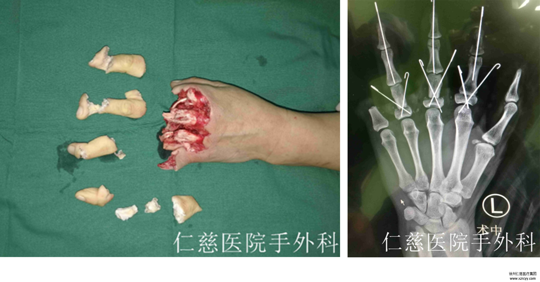 经了解,张女士的伤情非常严重,因为是绞伤,伤口边缘被毁损的参差不齐,血管、肌腱、神经等都毁损严重,且五指离断,接治起来非常困难。但凭借过硬的技术实力和丰富的断指再植经验,手外科三病区最终顺利完成了这例多指,多平面,绞肉机绞伤的断指再植。看着患者手指从不成形,到初具雏形,到一个个手指逐渐通血红润,虽然十余个小时的奋战让医生们都已精疲力竭,但还是露出了欣慰的笑容。