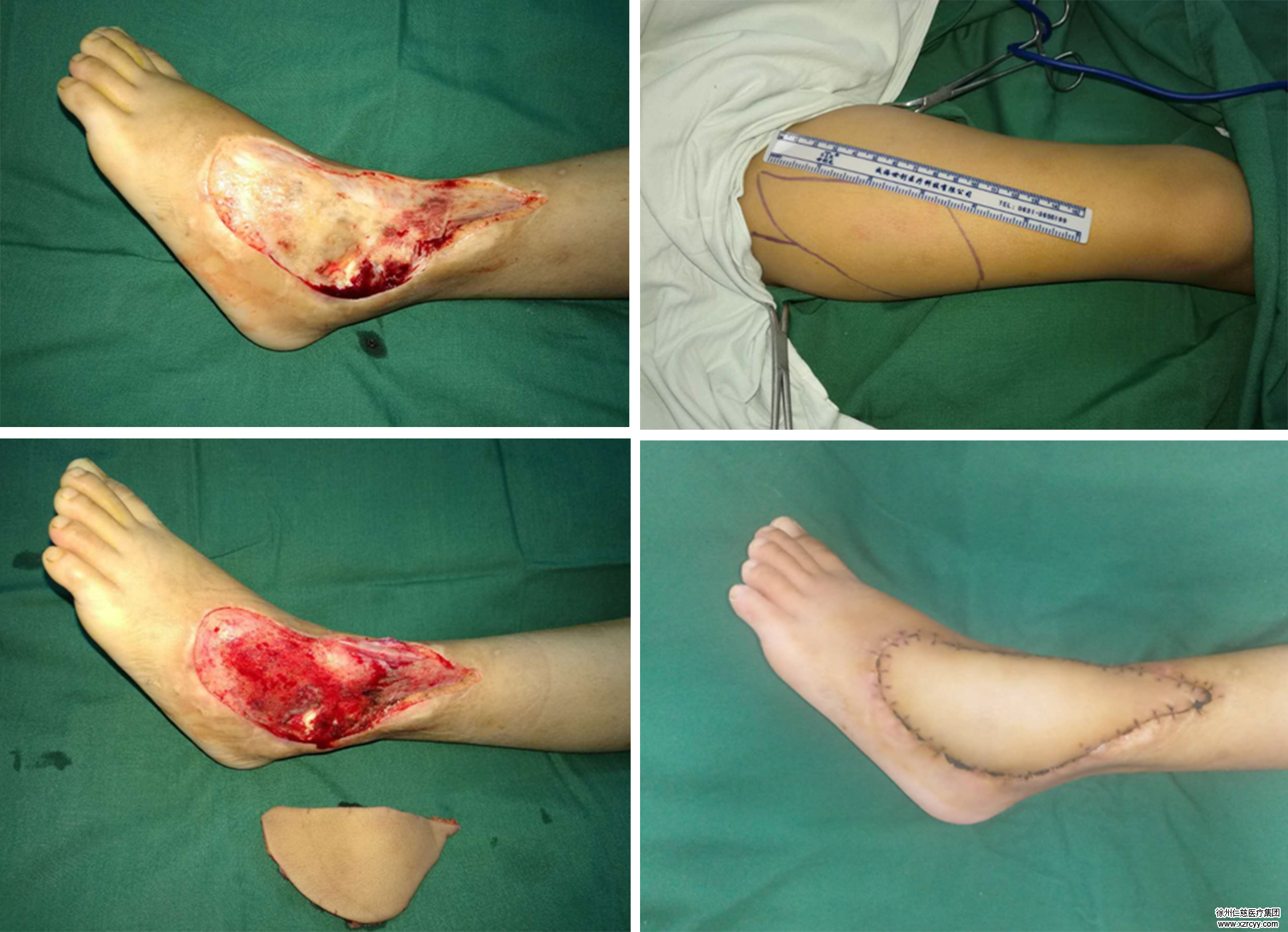 小雨浩被推入手术室,黎医生手术团队协力合作,由于伤口挫伤污染较重,一期清除创面污染、失活组织,修复断裂的血管、神经、肌腱,首先确保患肢成活。经过2小时手术,小雨浩被推出手术室,术后给予抗感染对症治疗。中间经过两次清创,雨浩左足创面清洁,满足皮瓣修复条件。