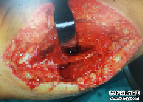 术中去除失活的皮肤及软组织,探查见右小隐静脉及3条粗大皮下静脉断裂,右胫骨前肌、趾长伸肌、腓骨长肌、比目鱼肌等断裂,反复用长效抗菌剂及可吸收止血材料彻底冲洗伤口,缝合修复断裂的肌肉,修复断裂的血管、神经,最终,一次性通血成功。