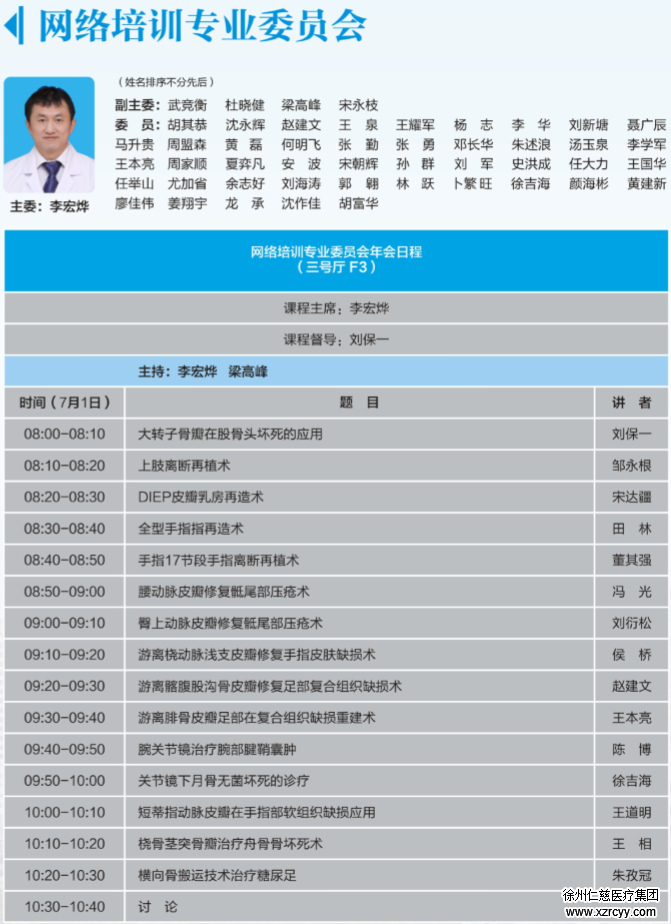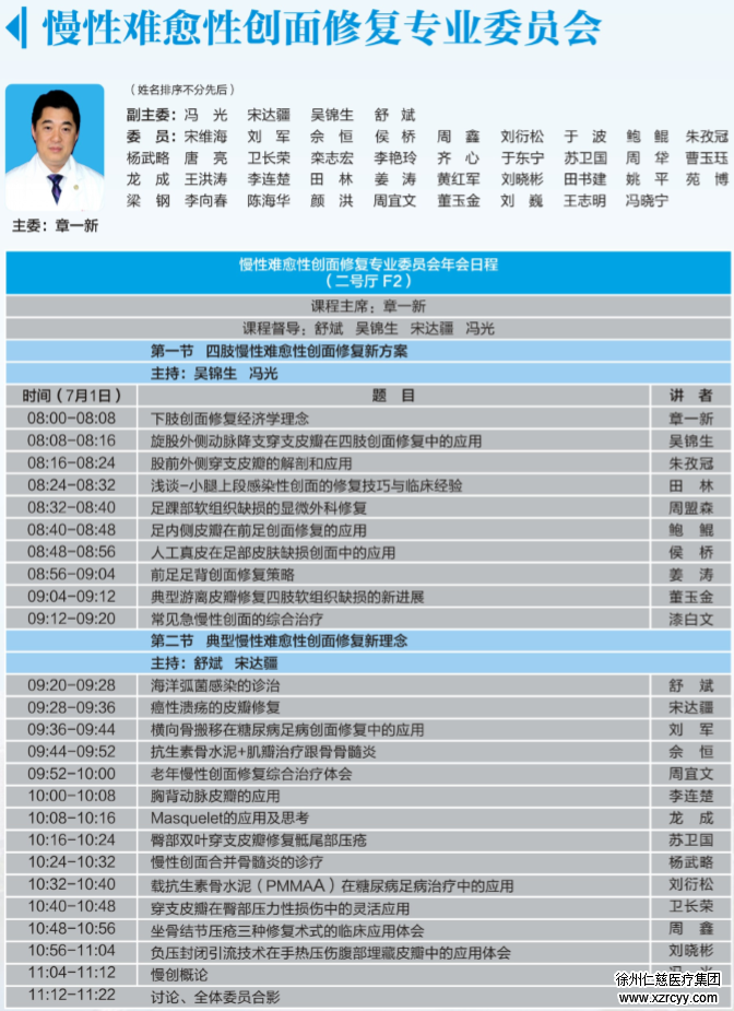 慢创显微修复科副主任刘衍松在7月1日上午的网络培训专业委员会分会场做《臀上动脉皮瓣修复骶尾部压疮术》的专题报告,之后还将在慢性难愈性创面修复委员会分会场做《载抗生素骨水泥PMMAA在糖尿病足病治疗中的应用》的学术分享,并主持了下午的分会场学术讲座。