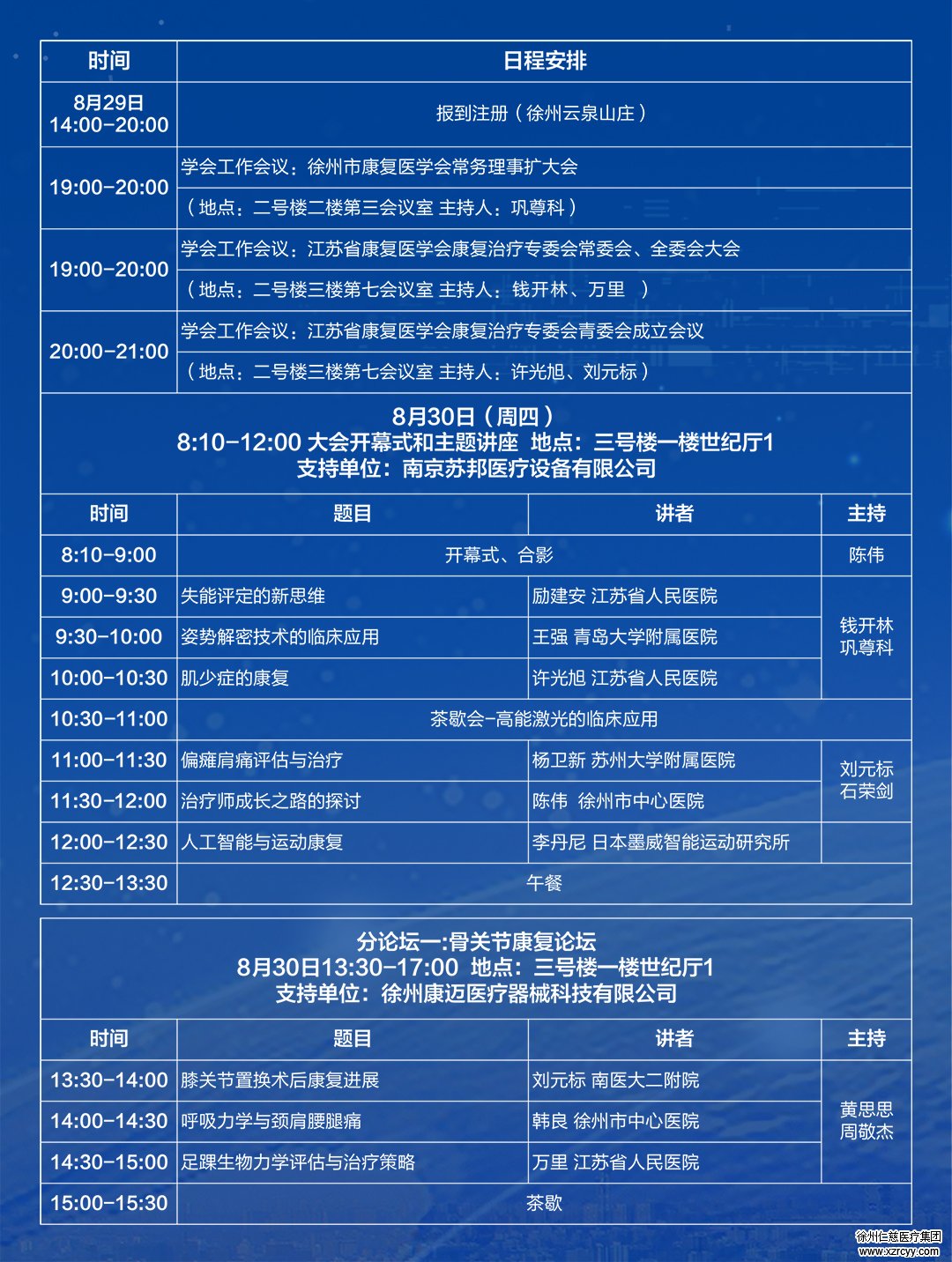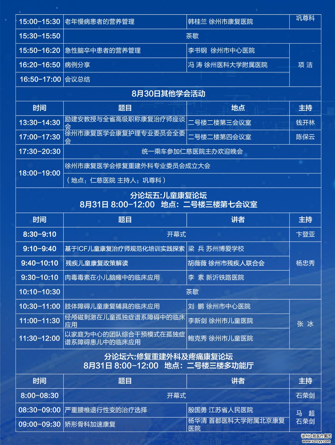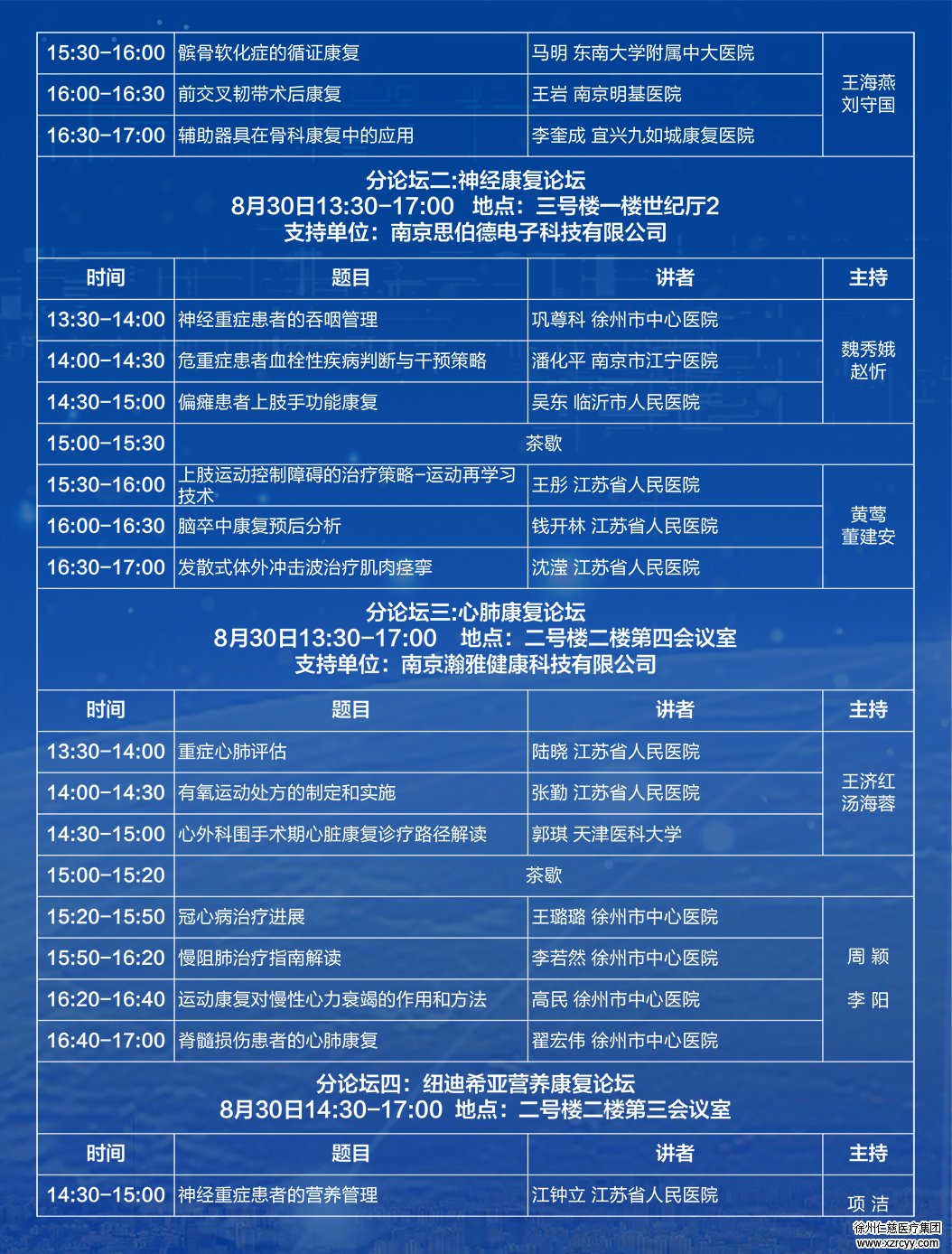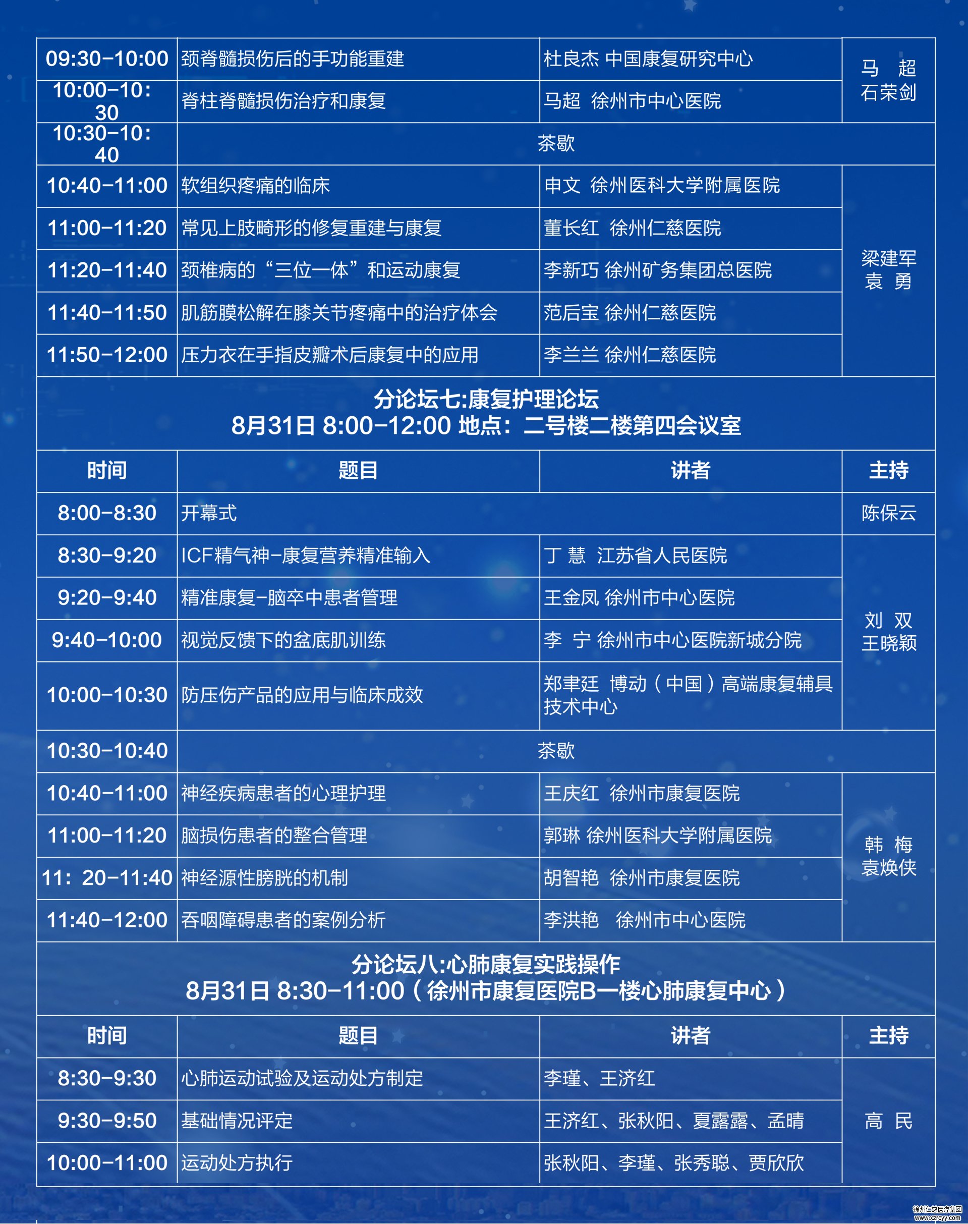 日前大会详细日程及专家授课课题确定,将展开骨关节康复治疗论坛,神经康复治疗论坛,心肺康复治疗论坛,营养康复论坛,儿童康复论坛,修复重建外科及疼痛康复论坛,康复护理论坛等八大分论坛;众多康复领域的专家教授、一线医疗骨干将在分论坛上分享自己一年来的临床与科研成果。