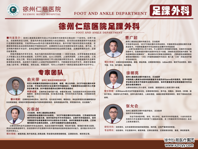 同时,西安红会医院梁晓军教授、北大人民医院徐海林教授、华山医院王旭教授、上海同济医院杨云峰教授、华西医院张晖教授、浙江大学医学院附属第二医院苗旭东教授、河北医科大学第三医院张奉琪教授、南京市第一医院桂鉴超教授、江苏省人民医院秦晓东教授、苏大二附院王培吉教授、苏大一附院张洪涛教授、上海同济医院张明珠教授、西安红会医院赵宏谋教授、徐州市中心医院王爱国主任等国内足踝学科知名专家学者将莅临大会并做学术分享交流。