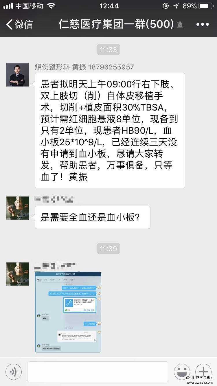 “患者拟明天上午09:00行右下肢、双上肢切(削)自体皮移植手术,切削+植皮面积30%TBSA,预计需红细胞悬液8单位,现备到只有2单位,现患者HB90/L,血小板25*10^9/L,恳请大家转发,帮助患者,万事俱备,只等血了! ”