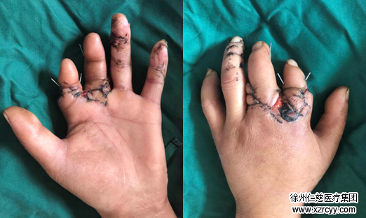 术前诊断:黄先生多根手指完全切断,左手示、中指部分损毁,腕和手水平血管损伤,特指手指指神经损伤,皮肤挫伤严重……唐医生手术团队为黄先生进行了左示中环小指清创,行“示中指再植+关节融合+环指血管神经肌腱修复术”,术中取血管移植,因为考虑到患者手背侧的皮肤损伤严重,静脉回流不好,因此尽可能多接背侧血管,目前看手术一切顺利,两根手指都成活了!