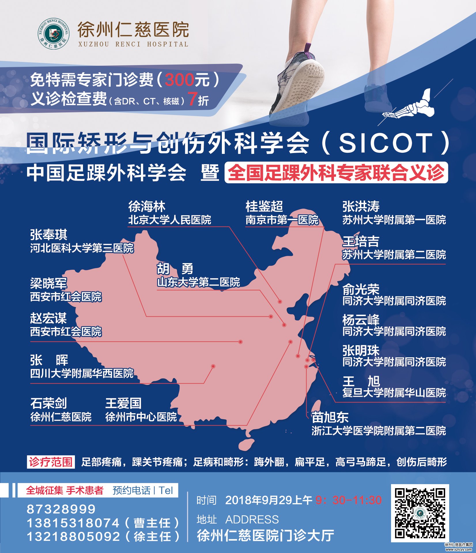 9月29日,全国足踝专家在betway在线登陆义诊,足病、踝关节疼痛、足病和畸形、踇外翻、扁平足、创伤后畸形患者都可前来就诊,免除300元特需专家门诊费,DR、CT、核磁检查费7折。