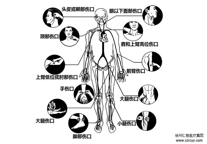 动脉出血一般血液呈鲜红色,因为出血部位的不同而用手加压止血的部位也不相同: