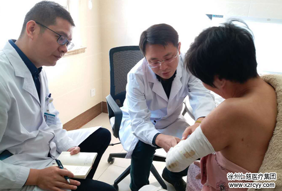 上午9点,50岁的金大姐(化名)在家人搀扶下进来,左胳膊左大腿都缠着长长的纱布,左手掌蜷不起来。金大姐告诉蒋教授,自己3个月前出车祸,在当地医院做完手术后,现在左臂抬不起来。
