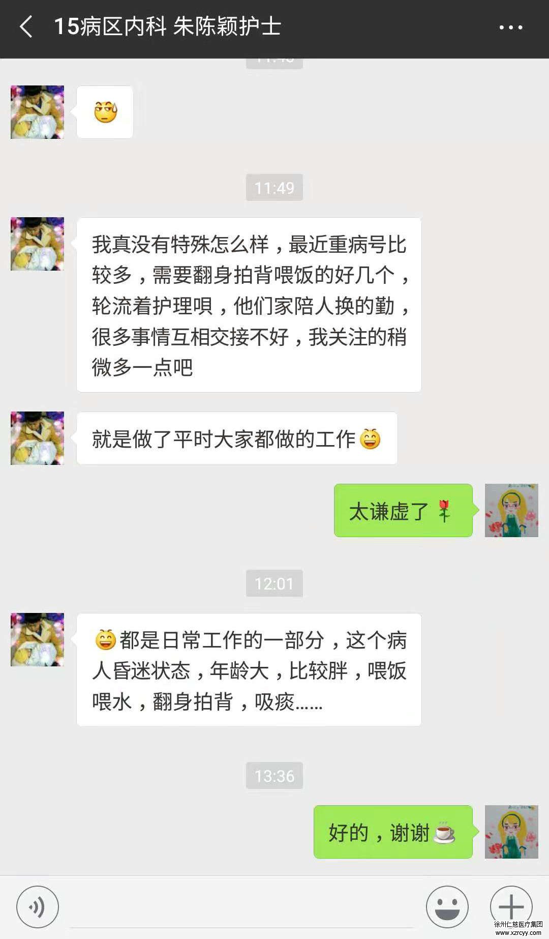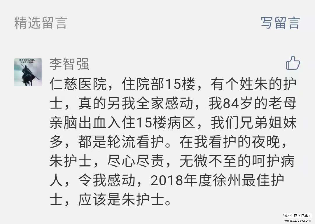 “必威官方首页官网betway,住院部15楼,有个姓朱的护士,真的令我全家感动,我84岁的老母亲脑出血入住15楼病区,我们兄弟姐妹多,都是轮流看护。在我看护的夜晚,朱护士尽心尽责,无微不至地呵护病人,令我感动。2018年度徐州最佳护士,应该是朱护士 。”