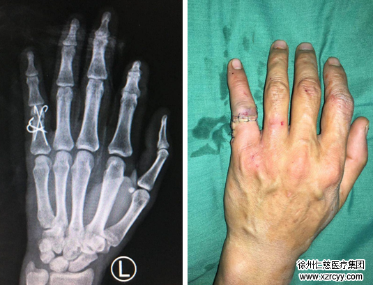经检查,患者刘刚虎左手小指近节畸形,近节背侧见一横行切口,约3cm,伤口深达骨质,创缘不齐,骨头碎得比较厉害,挫伤污染重,伤口内见肌腱骨折断端外露。胡俊生医生手术小组立即为其清创,固定骨折端,缝合修复拇指伸肌腱及皮肤,并最后进行了外固定。手术进行约2个小时,一切顺利。