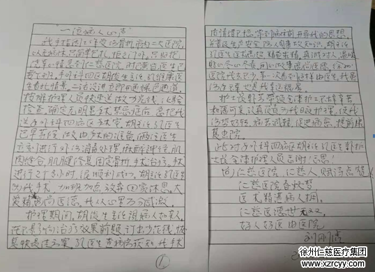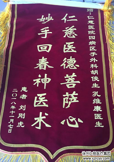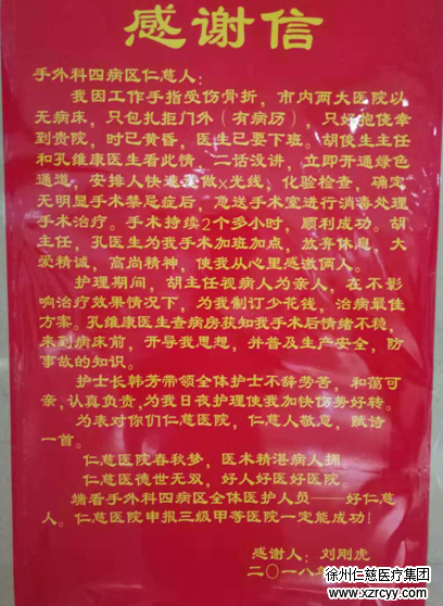 护理期间,胡俊生主任视病人如亲人,在不影响治疗效果前提下,定出少花钱、恢复快最佳方案。孔医生查房获知,我手术后情绪不稳,常到病床前开导我的思想,并普及生产安全、防人身事故知识。胡主任孔医生医术高超,精益求精,真诚对人,温暖贴心,尽心尽责,用心做事,高尚医德。徐州医院我去过不少,第一次看到这样好医生,我虽伤手不幸,也是我幸运福星。