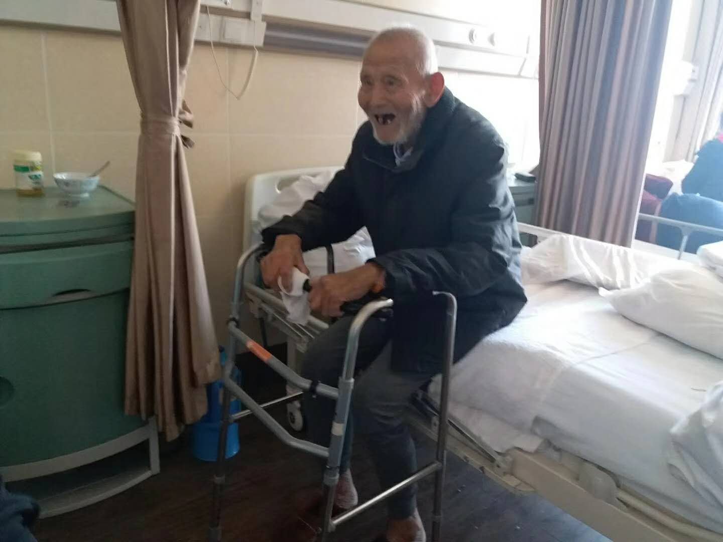 96岁的大爷摔骨折了,在关节科做完手术,几天后能下地行走了,老人笑得很开心。