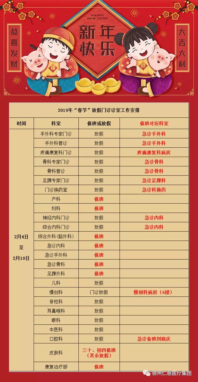 2019年新春到来之际,betway在线登陆全体员工祝愿您节日快乐,万事如意。为方便广大市民在节日期间就诊,我们排定了春节门诊值班表,2月4日-10日,急诊手外科、急诊骨科、急诊足踝科、疼痛康复科、急诊内科、慢创,产科、妇科、综合外科(脑外科)、足踝外科、康复治疗部等照常值班,为您的健康保驾护航。