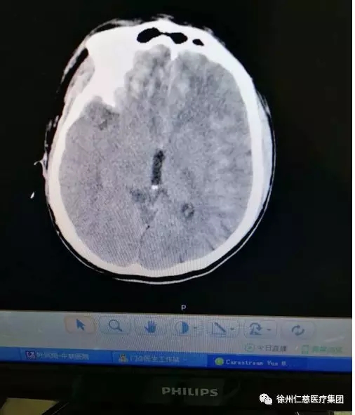 从CT片上可以看到病人右侧额颞部硬膜下血肿、额顶部硬膜外血肿、蛛网膜下腔出血、还有两额顶叶多发脑挫裂伤........于是病人转到脑外科,由脑外科医生接着处理。