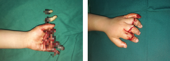 安徽淮北濉溪,小俊俊2岁10个月,4小时前在家里玩耍时,被压瓦机的链条绞伤左手,除拇指外4个小手指离断。