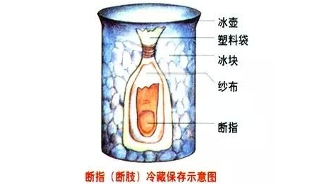 发生断指时,第一时间是进行现场急救。创口止血,用清洁的敷料压在创口上进行加压包扎。或用手指压住受伤手指根部掌侧两边,然后请家人帮忙尽快找到离断端的指体进行保存,再往医院送。断下来的手指的保存原则为干燥冷藏,禁止泡在水里。简单冲洗一下后用清洁的纱布包起来,放进防水的密封胶袋(如保鲜袋)里。建议胶袋边上放置冰块降温保存,但切记冰块不要直接接触断指。