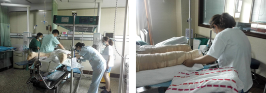 刘女士的烧伤情况非常严重,全身70%-80%面积烧伤。因为在火场地点有烟雾,对刘女士的呼吸道也造成了损伤。来我院的时候刘女士有休克表现,医护人员立刻对其进行了抗休克处理。