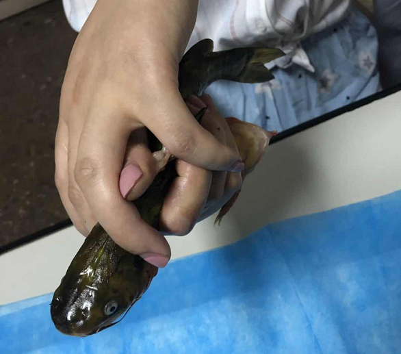 王女士说,鮥鱼坚硬的鱼鳍已经深深扎到她的小指里,十指连心,稍微动一下都疼,她不敢再擅自处理:“已经没法拔掉了,我必须托着鱼,正好大中午,大家看到我都很奇怪,说这个女的怎么大中午抱个鱼,穿着睡衣来医院,到底什么情况?”