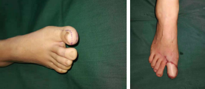 2020年1月9日,黎医生手术小组为沈大妈进行了左手示、环指的皮瓣修复和中指的再造。术中取右足第一趾的甲骨皮瓣移植再造左手中指,再游离旋髂浅皮瓣修复右足第一趾甲骨皮瓣供区创面。经过8个小时时间,手术顺利完成。