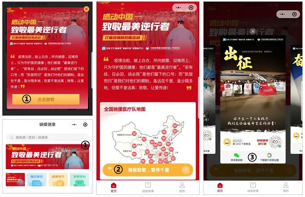 进入“蝴蝶健康”小程序,点击弹框或者首页上方的“致敬最美逆行者”横幅进入活动页面,生成致敬海报,邀请好友为英雄们加油,让爱传千里。