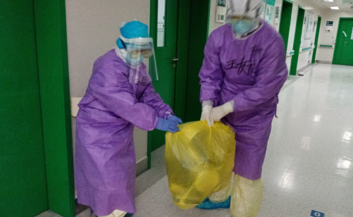 穿好防护服,由责任组长逐一检查,确保防护措施严格没有疏忽,合格才能进入隔离病区。每班王友龙和同事需要工作四个小时,除了日常护理工作外,因为缺少护工和保洁人员,他们还要承担发饭、打水、收拾餐后饭盒等工作,几乎没有停歇的时候。