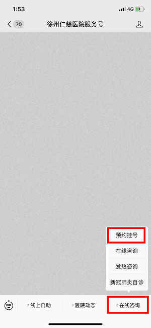 2.进入公众微信主页,点击左下角“预约挂号”键。