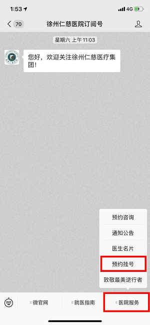 2.进入公众微信号主页,点击右下角“医院服务”,进入“预约挂号”。