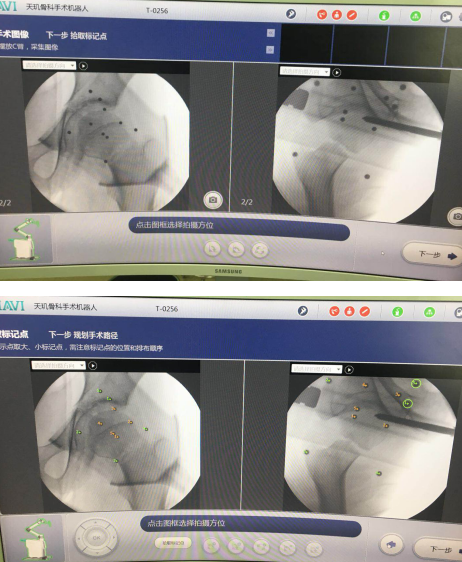 完善的术前准备后,手术开始。机器人“C臂”术中透视对小患者的股骨颈部位进行三维扫描,图像被同步传输至骨科手术机器人系统。同时,在导航系统屏幕上规划好钉道。随后,机器人的机械臂将手术工具精确定位到手术位置,套筒指向目的钉道的进钉点。任海东主任张子阳张恒军医生团队沿着套筒钻入导引针,确认位置无误后,置入3枚空心加压螺钉并通过导引针固定,拔出导针。C型臂透视,骨折对位对线良好,活动左髋关节无阻碍感及异常弹响,手术顺利结束。