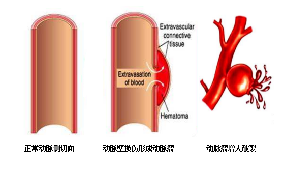 正常的动脉壁既有韧性又有弹性,可以耐受血压的持续冲击。动脉粥样硬化、创伤、细菌感染、先天性动脉壁薄弱等可以引起动脉管壁结构异常或损伤,在血流冲击下,血管壁局部异常扩张超过正常直径的50%即形成动脉瘤。